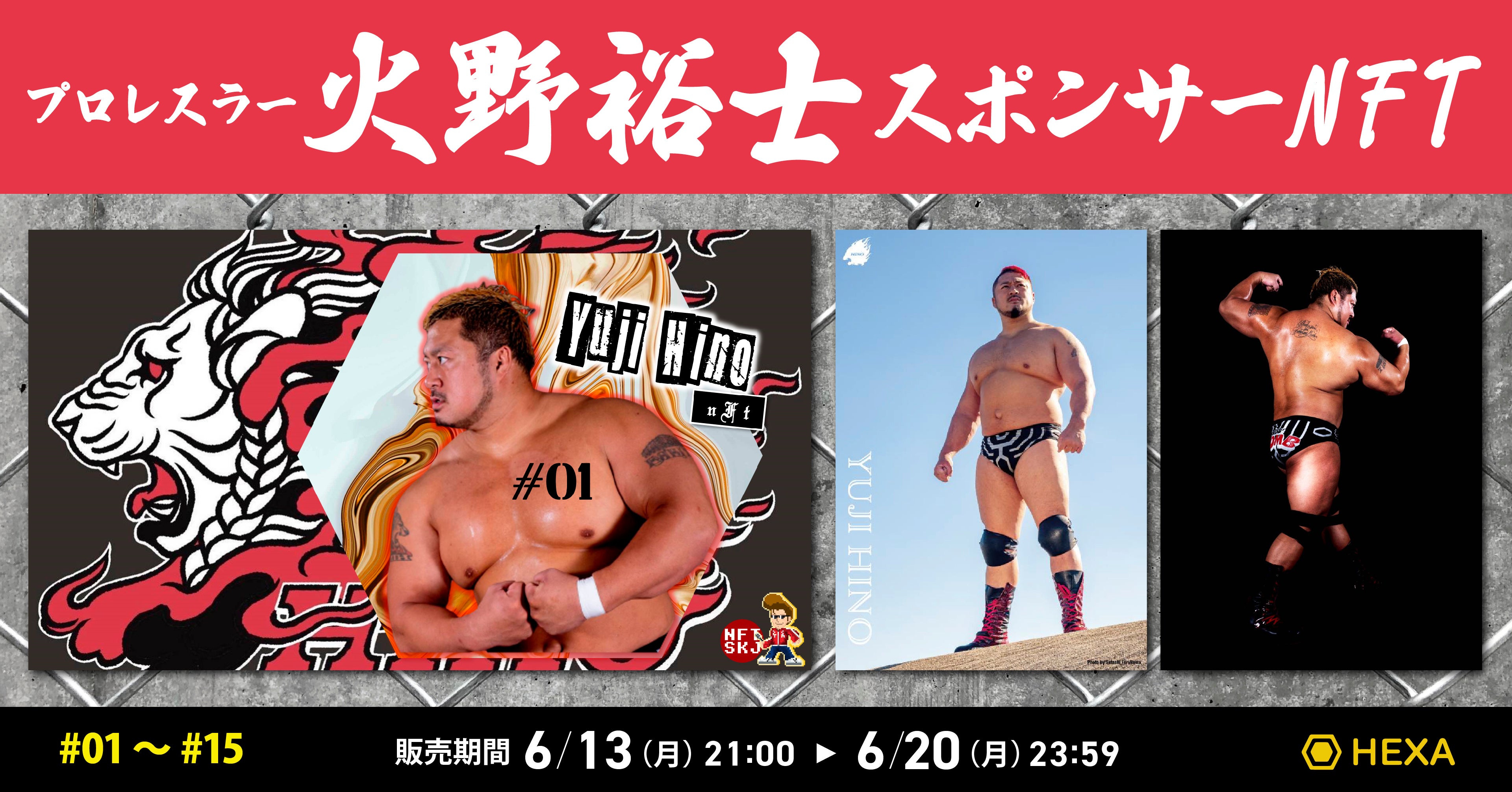 NFTマーケットのHEXA(ヘキサ)では、プロレスラー「火野裕士」のスポンサーNFTを6/13(月)21時から販売します。個人が直接選手をスポンサーできる新しいWEB3.0施策となります。