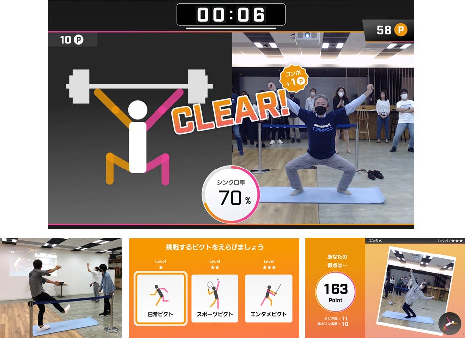 1人ずつ実施するスポーツです。プレイヤーが対応すべき姿勢を示すピクトグラムが正面の画面に表示されます。カメラで撮影したプレイヤーの全身画像が画面に投影され、プレイヤーは画面を見ながら体幹の向き、手足の角度・向きがピクトグラムに類似するように制限時間内に姿勢を変化させます。本スポーツには、パナソニック コネクトの骨格推定技術が採用されています。カメラで撮影した全身画像から肩・肘・膝に代表される関節位置と関節をつなぐ骨格を推定することで、プレイヤーの体幹の傾き、手足の角度・向きを算出します。これによりピクトグラミーが指示する姿勢とプレイヤーの姿勢の類似度が判定可能となります。右腕と左腕、右足と左足も区別しているため、正確な姿勢の再現がプレイヤーに求められます。