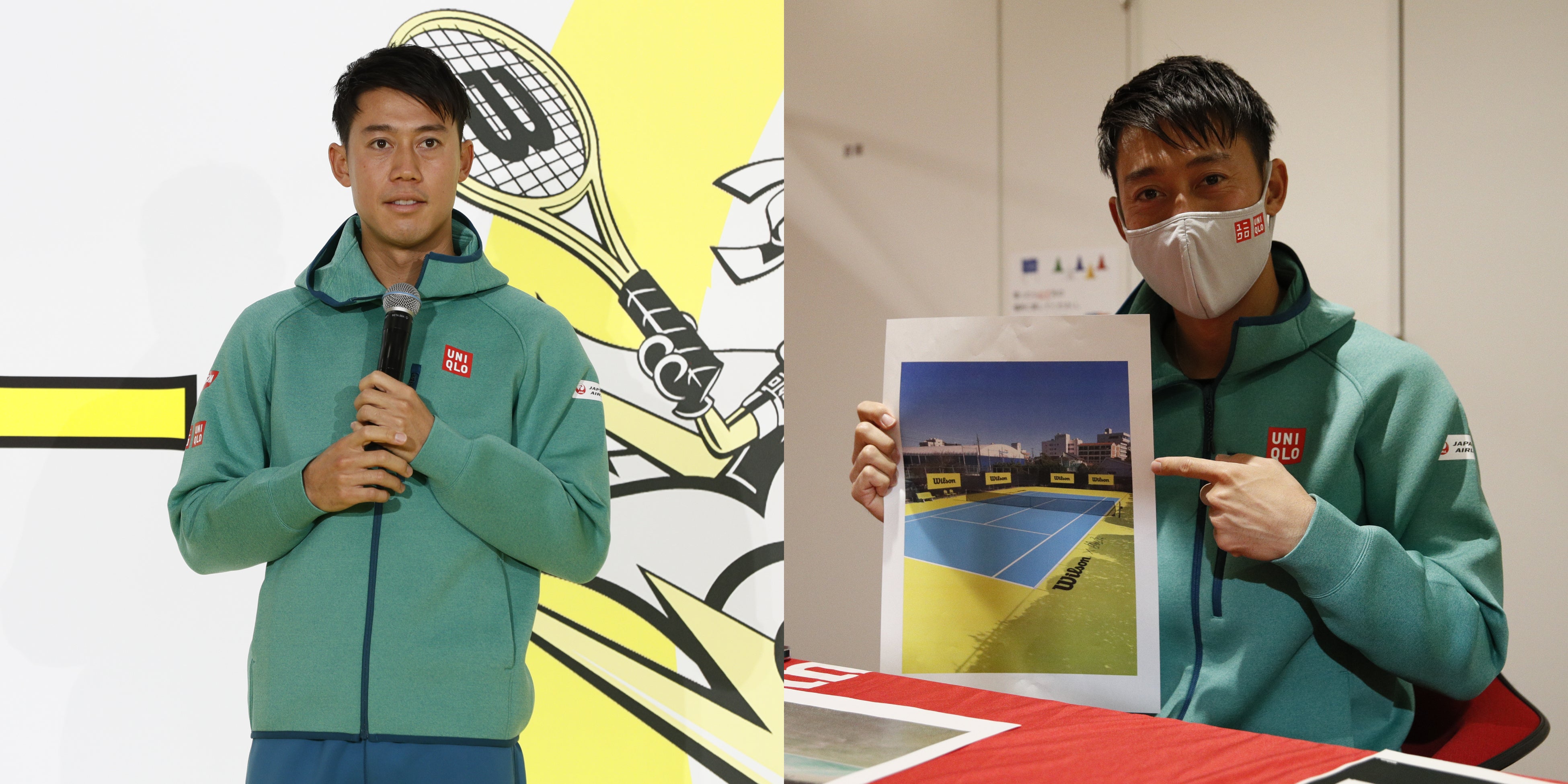 会場の皆さんこんにちは、錦織圭です。今日はコートに行くことができず、一緒にお祝いができず、申し訳ありません。いつか、僕も 白子町のコートに行って、皆さんと一緒にテニスができたらいいなと思います。私とウイルソンの想いが詰まったテニスフィーバーコート ですので、皆さん、この新しいコートで遊んでみてください。僕も今は怪我をしていますが、怪我を治して、復帰して、またいつか、強く戻って来られるように頑張ります。ぜひこれからも、白子町のテニコートと僕の応援をよろしくお願いいたします。