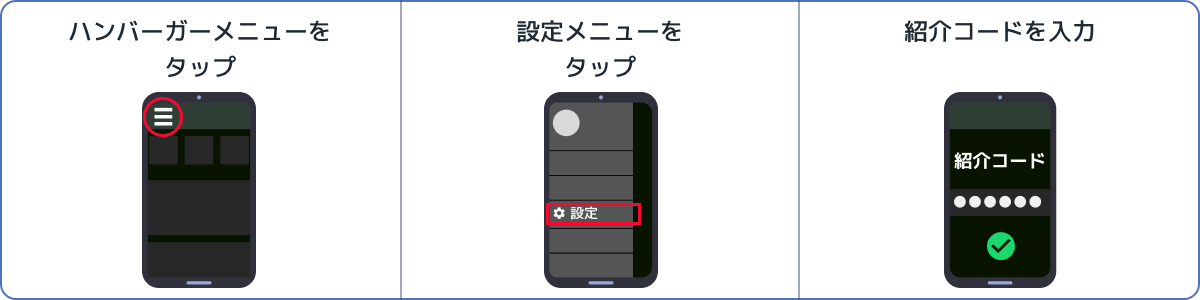 STEP2:紹介コードを登録します。左上の「≡(メニュー)」>「設定」より「紹介コード入力」を選択。紹介コードを入力し、画面右上の「保存する」を押すと完了です。