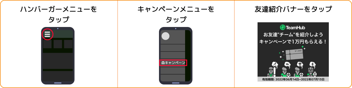 STEP1:TeamHubアプリ内のメニューの「キャンペーン」より、遷移した画面の一番下にある、「友達紹介バナー」をタップします。