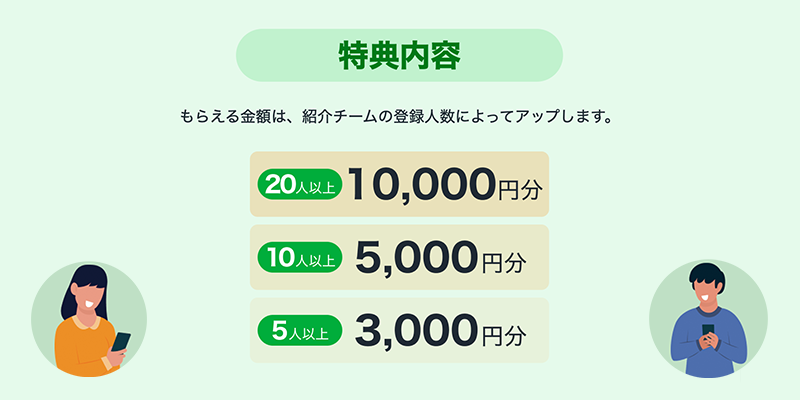 紹介コードをシェアして、紹介された人がチームを作成すると、 紹介したチーム、されたチームそれぞれにスポーツ用品店で使える商品券をプレゼント。商品券の金額は、紹介されたチームの登録人数が多ければ多いほどアップし、最大10,000円の商品券がもらえます!