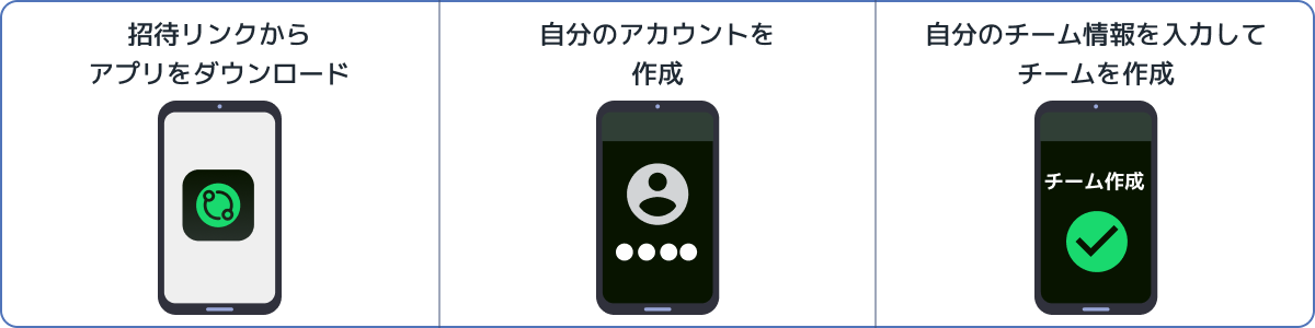 STEP1:友だちから送られてきたリンクをタップし、TeamHubアプリをダウンロード。アプリを開き、ガイドに従って新しいチームを作成します。