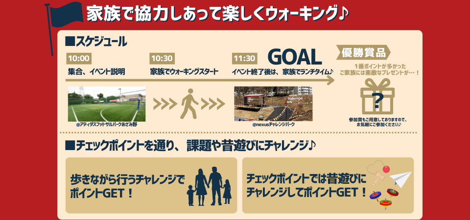 アディダスフットサルパークあざみ野からスタートし、各チェックポイントを経由してゴールのnexusチャレンジパークを目指します。また、歩きながら行うチャレンジや各チェックポイントでの昔遊びのチャレンジでポイントをGETして、各家族で成績を競い、優勝したご家族には商品がございます。イベント終了後には、ご家族でnexasチャレンジパーク内にて、ランチタイムを取ることができます。