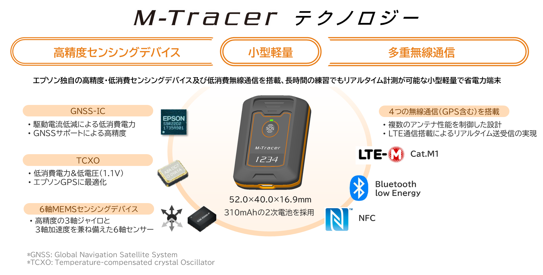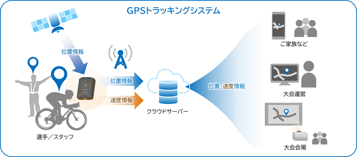 エプソン独自の高精度・低消費センシングデバイス及び低消費無線通信を複合した「M-Tracer」テクノロジーによって、トライアスロンのような長時間競技でも、リアルタイムで位置や運動情報の計測および可視化が可能なシステムです。