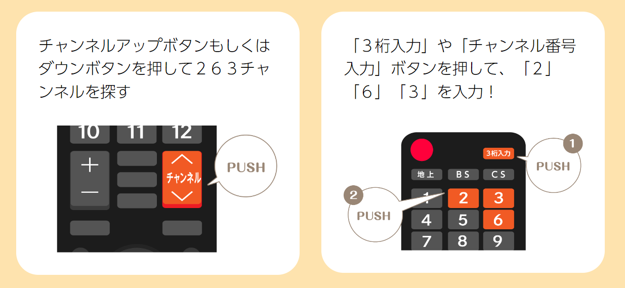 ③「番組表」の中から右左ボタンで 「BSJapanextチャンネルロゴ」(263ch)を見つけて選択※BS視聴環境がない方は別途準備が必要となります