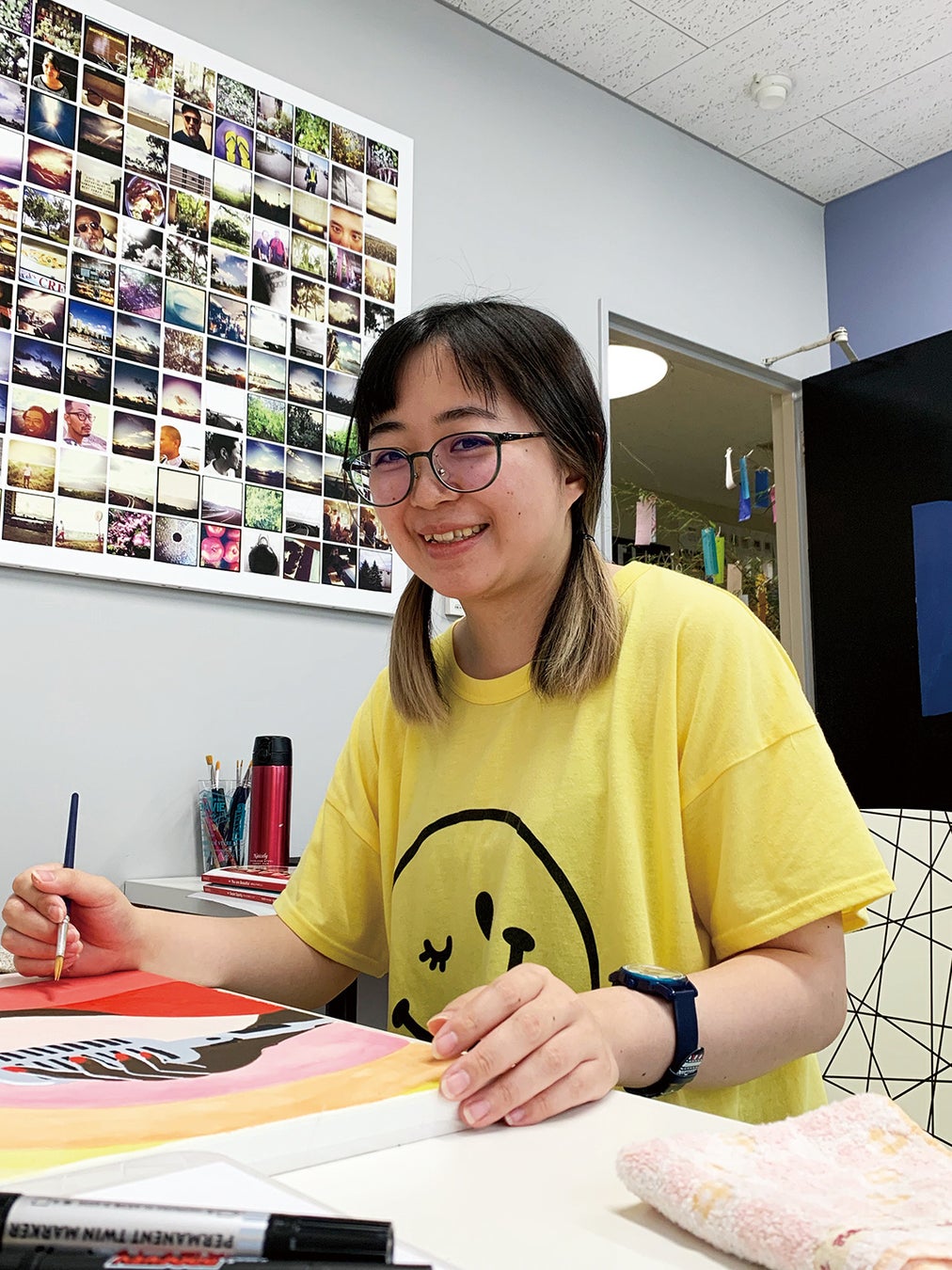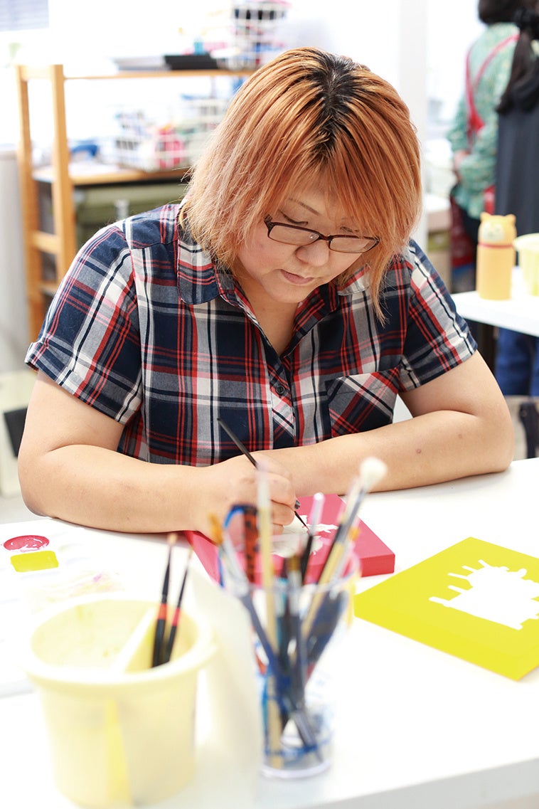 彼女が描く作品は絵画だけにとどまらず、布、粘土、段ボール等色んなものとコラボレートされた作品。その幅広い作風は、彼女の持つ探究心の賜物。彼女の作るアートから目が離せない。