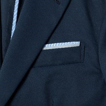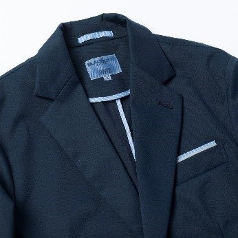 チームロゴに使用されているブルーと白がミックスしたパイピングはスーツ生地のネイビーとも色馴染みが良く、統一感のある爽やかな印象を演出。 腕まくりした時にアクセントにも 。