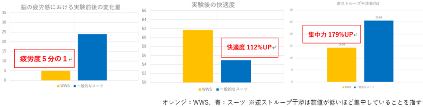 鹿屋体育大学と行った自社初となる受託研究では、一般的なスーツとWWSを着用した際の心理的評価を表す脳波を比較調査し、WWSだと着用時の快適度が高く、疲労感を与えにくいことが判明しました。また、作業効率を図る実験では、WWS着用時は一般的なスーツに比べて他の環境に干渉されづらい状況にあり、認知機能が優れ集中力が向上する傾向があることも判明しました。