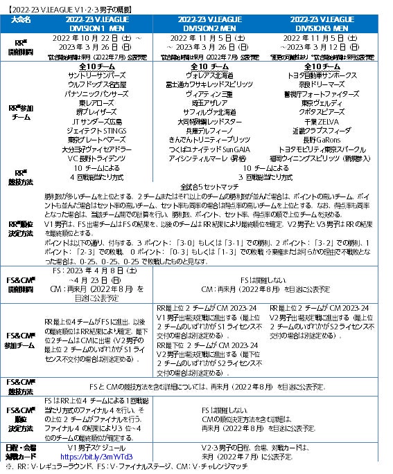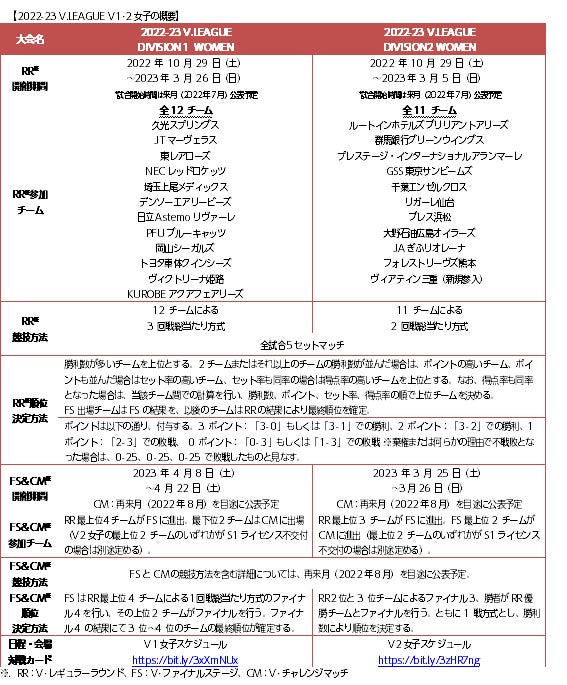 V1男子は10月22日(土)に、V1女子・V2女子は10月29日(土)に開幕し、いずれも翌年3月までV・レギュラーラウンドを戦い抜きます。その成績によって、V・ファイナルステージとV・チャレンジマッチへの出場チームが決定します。詳細については再来月(2022年8月)を目途に公表する予定です。 V2・3男子の日程、会場、対戦カードは、来月(2022年7月)に発表します。