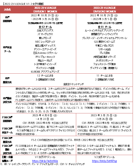 2022-23 V.LEAGUEの開催要項およびDIVISION1 MEN & WOMEN (V1男子・V1女子)とDIVISION2 WOMEN(V2女子)の日程、会場、対戦カードを発表します。