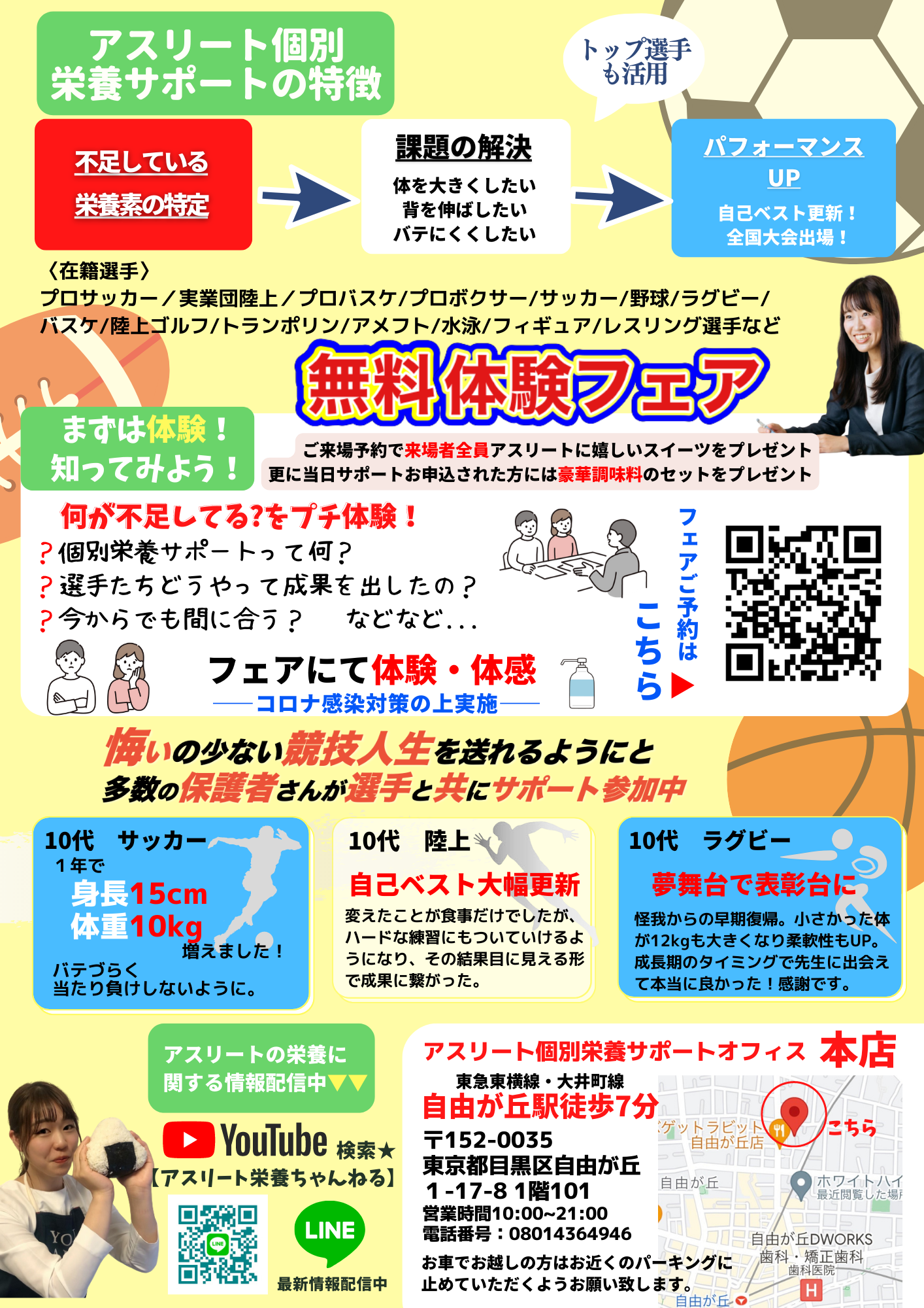 株式会社ほおばる(代表取締役社長:喜多みのり、所在地:東京都目黒区自由が丘)は、アスリート専門栄養サロン『アスリート個別栄養サポート』を東京・自由が丘に2022年6月25日(土)にオープンします。小学1年生〜プロ選手まで試合や合宿などに向けての個別の食指導を、血液検査や各種データを用いて不足栄養素を特定するパーソナル型栄養指導を展開。