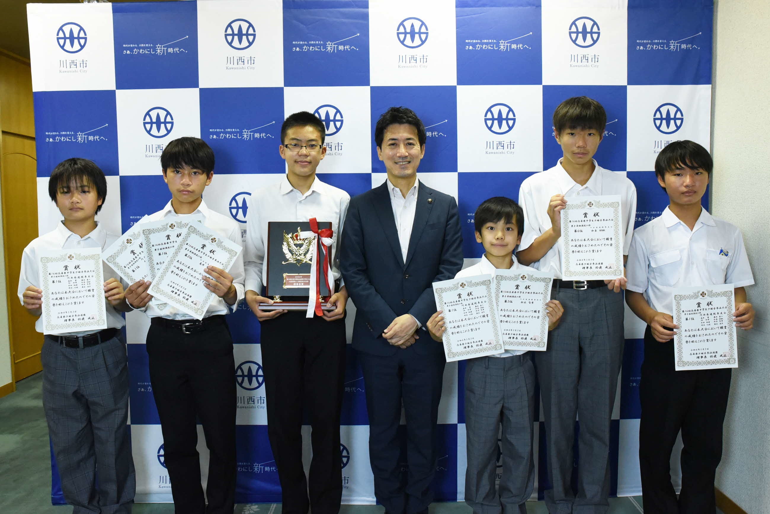 この日、川西市役所を訪れた6名は、表彰盾と賞状を手に、入賞報告会兼全国大会出場激励会に出席。