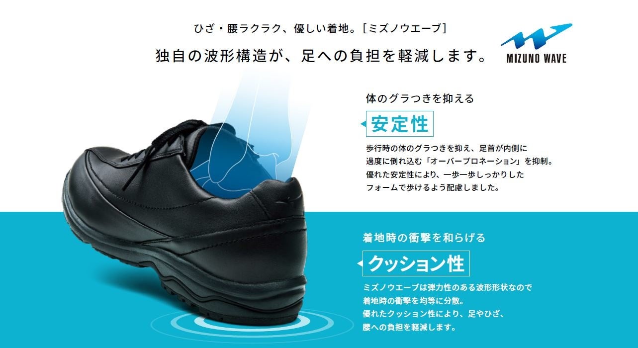 ソール部分にはミズノが独自に開発した波形プレート『ミズノウエーブ』を搭載しています。『ミズノウエーブ』は、接地した際の衝撃を分散し、足への負担を減らします。また、歩行時の身体のグラつきを抑制するので、安定した歩行をサポートします。クッション性と安定性を両立することで、歩く時の足への負担を軽減します。