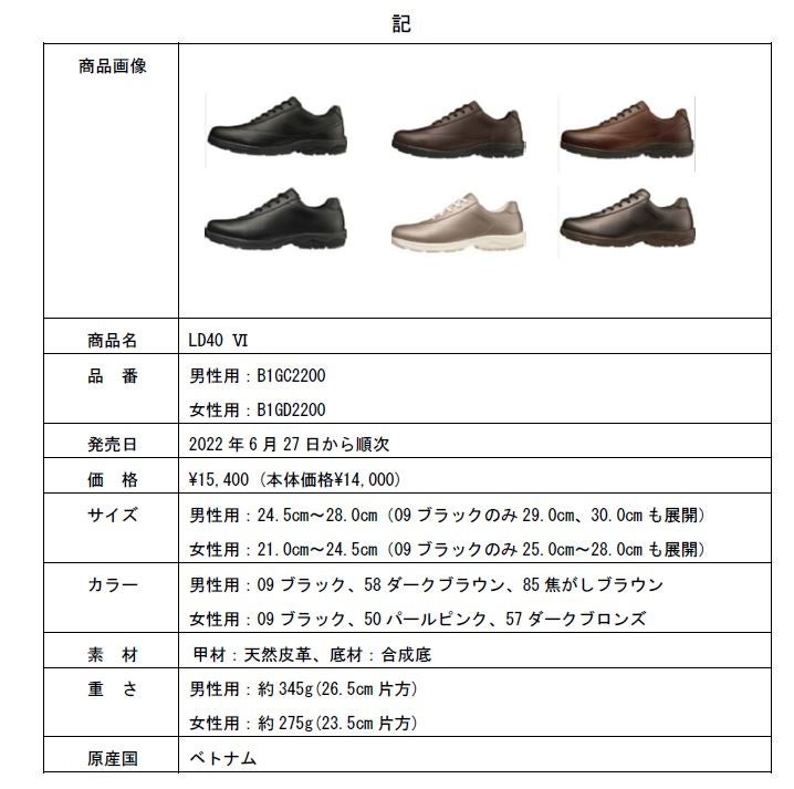 「LD40」シリーズは、2006年の発売から累計販売数140万足※を超えるロングセラー商品です。発売当初はウォーキング大会などで40kmという長距離を快適に歩行できることをコンセプトに開発され、その機能性は徐々に日常生活における歩行を楽にするためのものへと進化を遂げてきました。今回の「LD40 Ⅵ」では機能性はそのままに価格を2,000円安く設定し、より多くのお客様が手に取りやすい価格を実現しました。また、男女で異なるデザインを採用し、ウォーキングに限らず日常の外出や旅行など幅広いシーンでご利用いただけます。