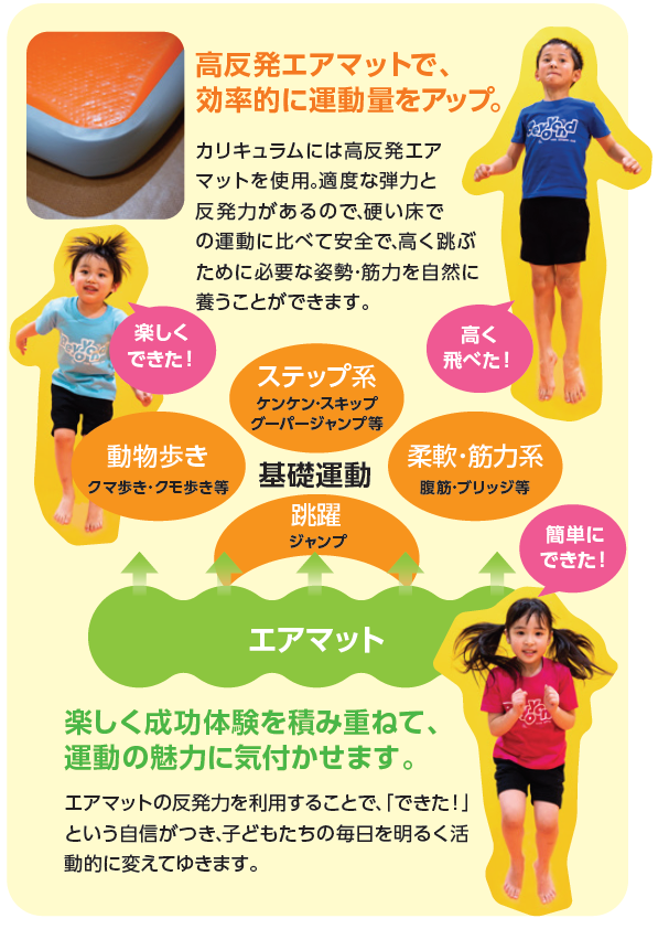 エアマットの反発力を利用することで、「できた!」という自信がつき、子どもたちの毎日を明るく活動的に変えていきます。