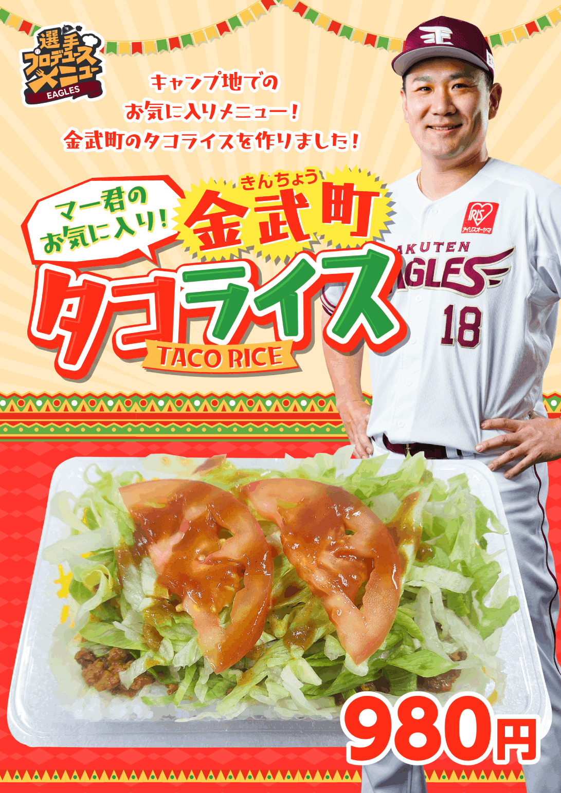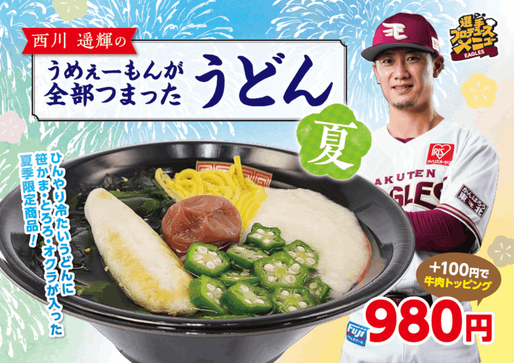 株式会社楽天野球団(本社:宮城県仙台市宮城野区、代表取締役社長:米田 陽介)は、6月24日(金)より、田中 将大選手がプロデュースした「マー君のお気に入り!金武町タコライス」と西川 遥輝選手がプロデュースした「西川遥輝のうめぇーもんが全部つまったうどん【夏】」を、楽天生命パーク宮城の飲食売店にて販売することとなりましたので、お知らせいたします。