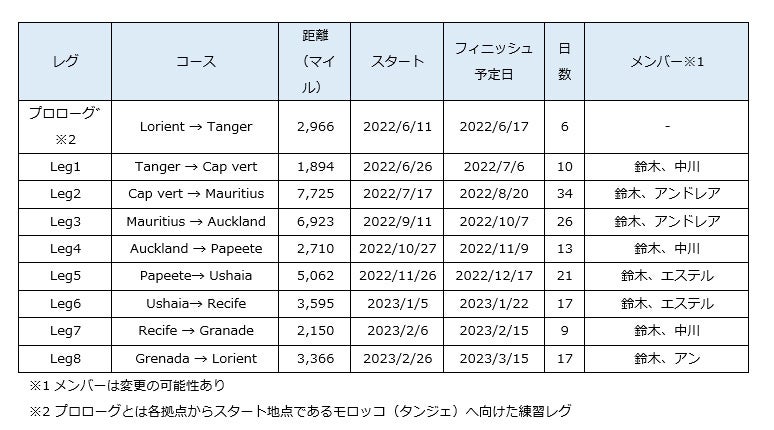 「Globe40」は、クラス40(全長40フィート=約12m)のヨットにセーラーが交代で2人ずつ乗り込み、風の力だけで世界を一周するレースです。予選レースを通じ条件をクリアしたチームが出場できます。2022年6月26日にモロッコ・タンジェをスタートし、途中8ヵ所に寄港しながら全30,000マイル(55,000km)を約9カ月かけて、最終フィニッシュ地のフランス(ロリアン)を目指します。