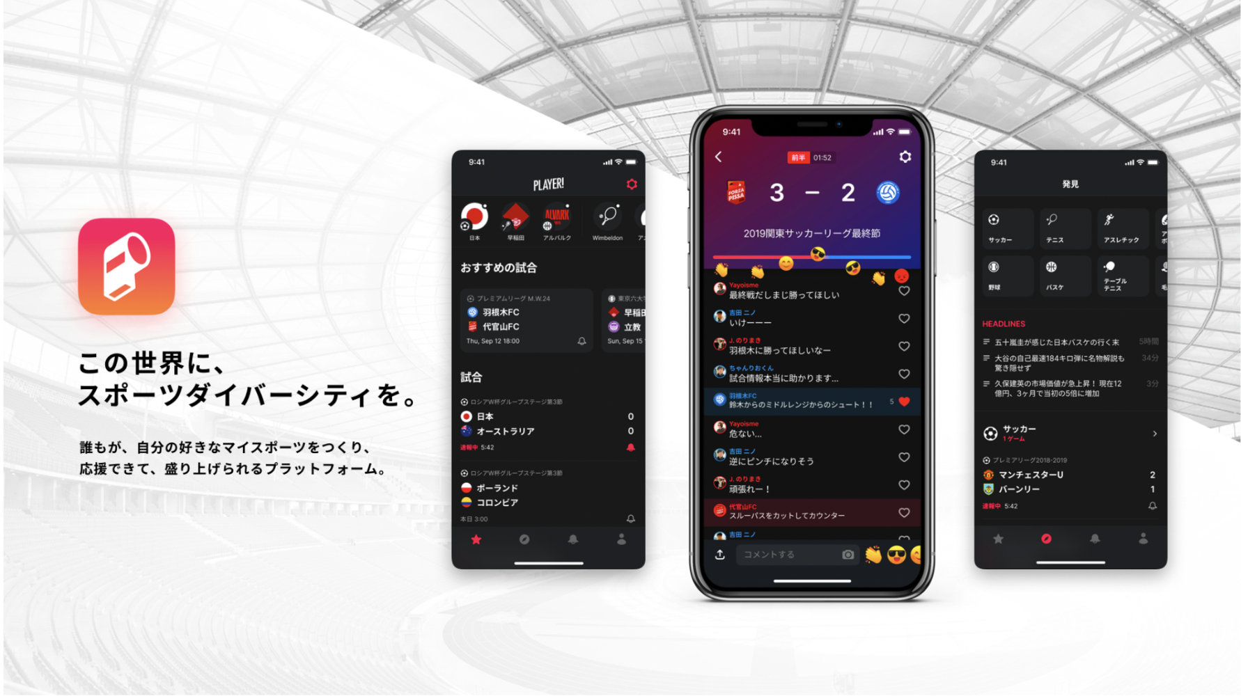 Player!は、誰もが、自分の好きなマイスポーツをつくり、応援できて、盛り上げられるプラットフォームです。この50年間、スポーツ産業はマススポーツ、マスメディア、マススポンサーの三位一体で発展してきました。ファンの少ないスポーツは全国放送に耐えられず、マスメディア中継がなく、マススポンサーがつかず、どんどんマイナースポーツ化していく。マススポーツとマイナースポーツに大きな格差が生まれてしまったのが、昭和と平成の時代でした。必死に頑張っているソフトボール選手やそれを応援しているお母さんにとって、それは本当にマイナーなスポーツなのでしょうか。Player!は、「マススポーツ」ではなく「マイスポーツ」があるライフスタイルを提案します。自分のお気に入りの街をみつけて、その街に住んでみて、そしてその街が好きになって、その街を盛り上げることに貢献するのってちょっと楽しかったりするように。スポーツも、自分ならではのお気に入りのスポーツをみつけて、そのスポーツを好きになり、そのスポーツを盛り上げていくことに貢献できたら楽しいはず。Player!は誰もが自分の好きなマイスポーツをつくり、応援できて、盛り上げられる世界をつくります。この世界に、スポーツダイバーシティを。