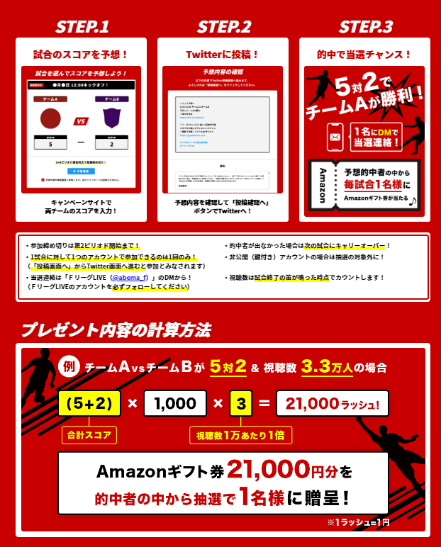 今シーズンは、ABEMAの新企画が登場!キャンペーンサイト「ゴールdeラッシュ」からスコアを予想すると、予想が的中した方のなかから抽選でAmazonギフト券をプレゼント。インターネットテレビ局「ABEMA」の「SPORTSチャンネル」にて生中継いたしますので、ぜひご視聴ください。