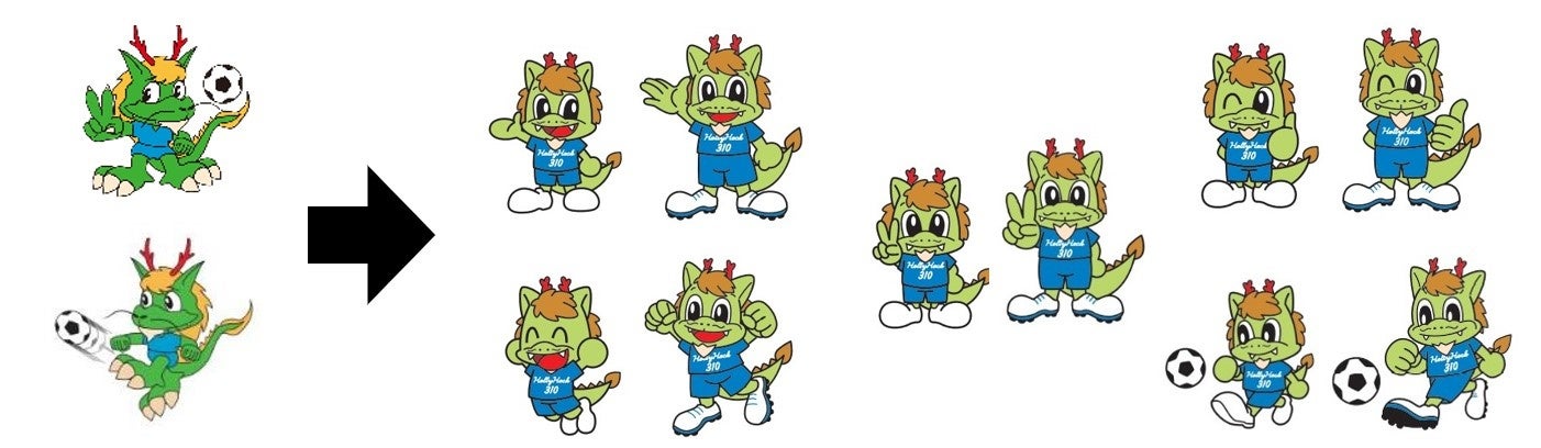 3等身:5パターン<基本ポーズ(ピース)、ボールを蹴る、片手を上げる、グッドサイン、ガッツポーズ>計10パターン