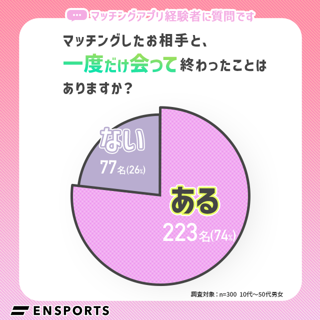 「マッチングしたお相手と一度だけ会って終わったことはありますか?」という質問に対し、74%の方が「ある」と回答する結果に。マッチングアプリでうまくいかない原因とは?(https://www.ensports.com/magazine/matching-app-does-not-work)