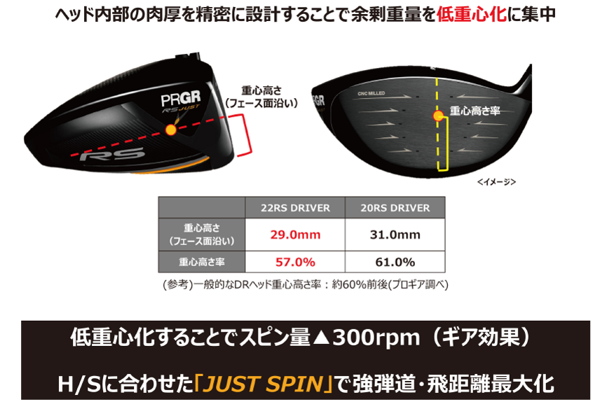 「RS JUST」ドライバーは、ゴルファーが打つエリアと最大反発エリアを一致させるためフェースセンターに重心点、最大たわみ点、最高CT点を集中させる「4点集中設計」の精度を従来より高め、フェースセンターでヒットした際の初速性能をさらに高めました。また、フェースセンターの最薄部を点からエリアに広げたことでフェースセンターが広く大きくたわみ、広い高初速エリアを獲得しています。これらのフェース設計の追求によって生まれた「4点集中フェース」により、従来品を超える高初速性能を実現しています。このほか、ヘッド内部の肉厚を精密に設計し余剰重量で低重心化を図ることで、ギア効果による低スピン化を実現し、バックスピン量の増減が飛距離に大きく影響するヘッドスピード40m/s以上のゴルファーの飛距離アップを可能にしました。