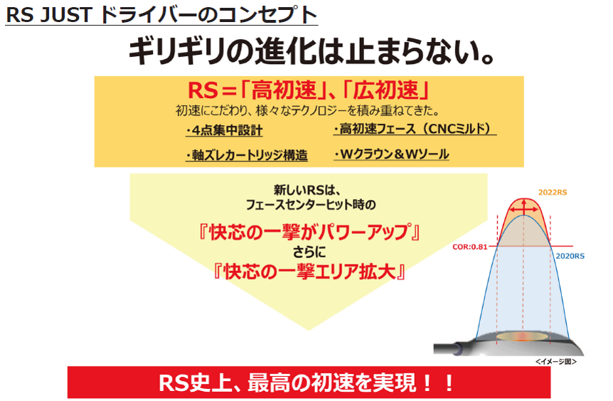 (株)プロギアは、ゴルフを真剣に楽しむアスリートゴルファー向け「RS(アールエス)」シリーズをフルモデルチェンジし、“ギリギリの飛び”に新たに「4点集中フェース」を搭載することで高初速を超えた“驚初速”を生み出す「RS JUST(アールエス・ジャスト)」ドライバーを7月22日から順次発売します。