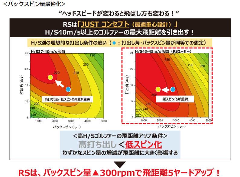 「RS JUST」ドライバーは、ゴルファーが求める弾道、スイング、イメージに合わせて「JUST FIT(最適)」なドライバーが選べるよう、左へのミスを軽減し叩けて強弾道の「RS F(エフ)DRIVER」、ストレートフェースで高い操作性と強弾道の「RS DRIVER」、つかまりが良くハイドローで攻められる高弾道の「RS D(ディー)DRIVER」の3モデルをラインアップします。また、最適重心設計「JUSTコンセプト」によるバックスピン量の最適化で、ヘッドスピードの速いゴルファーの最大飛距離を引き出します。