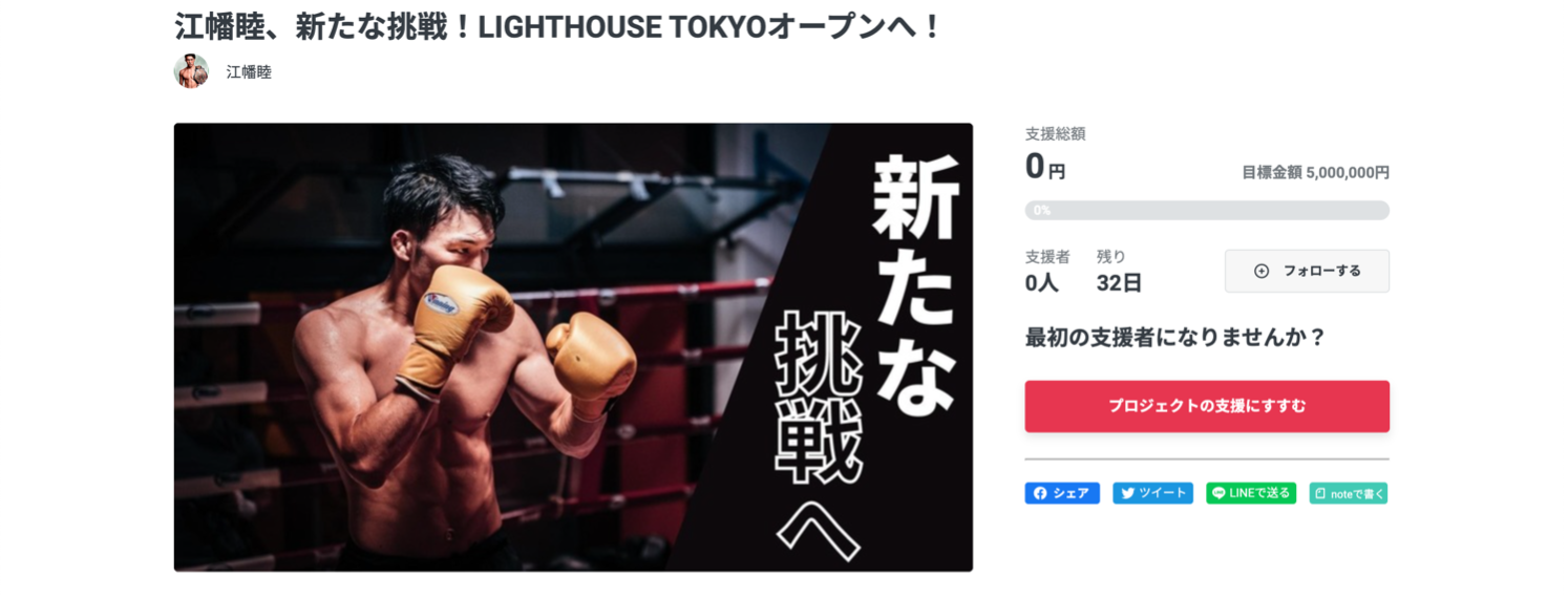 キックボクシングWKBA世界バンタム級王者の江幡 睦(えばた むつき)は、この度キックボクシングパーソナルフィットネスジム『LINGHTHOUSE TOKYO』(場所:東京都渋谷区、代表:江幡 睦)を9上旬に設立予定です。設立にあたり、6月27日(月)22時よりREADYFORにてクラウドファンディングを開始いたします。