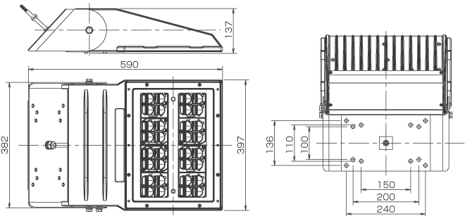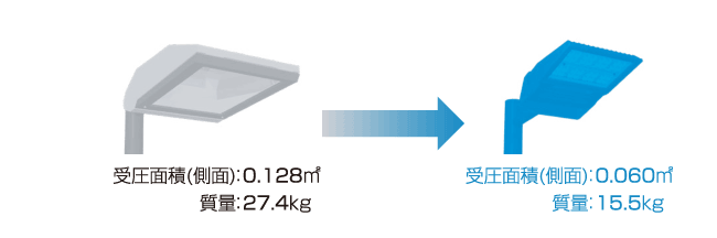 従来HID照明器具(※1)と比較して受圧面積比53%の小形化(0.128m²→0.060m²)、質量比で43%の軽量化(27.4kg→15.5kg)を実現しました。