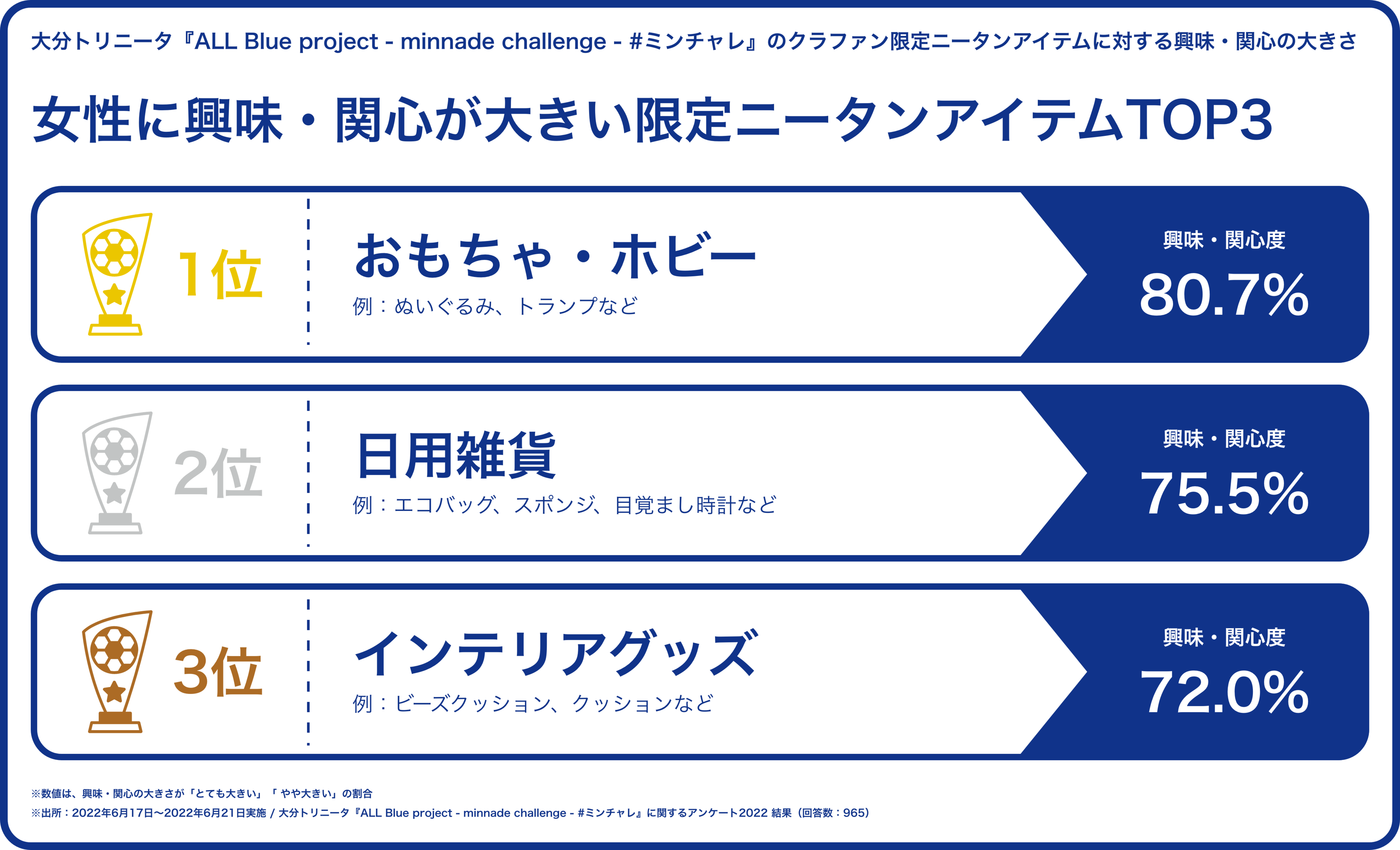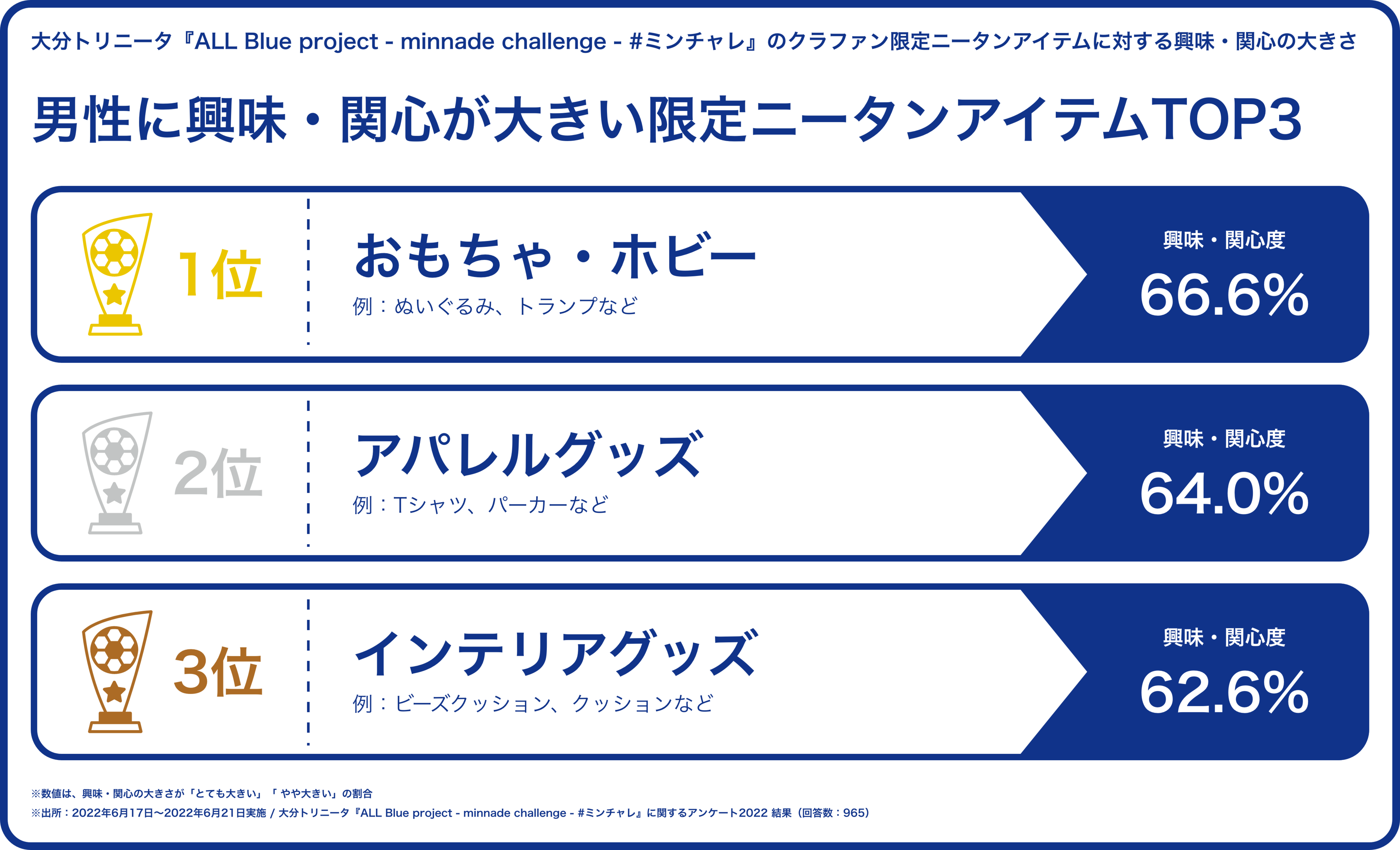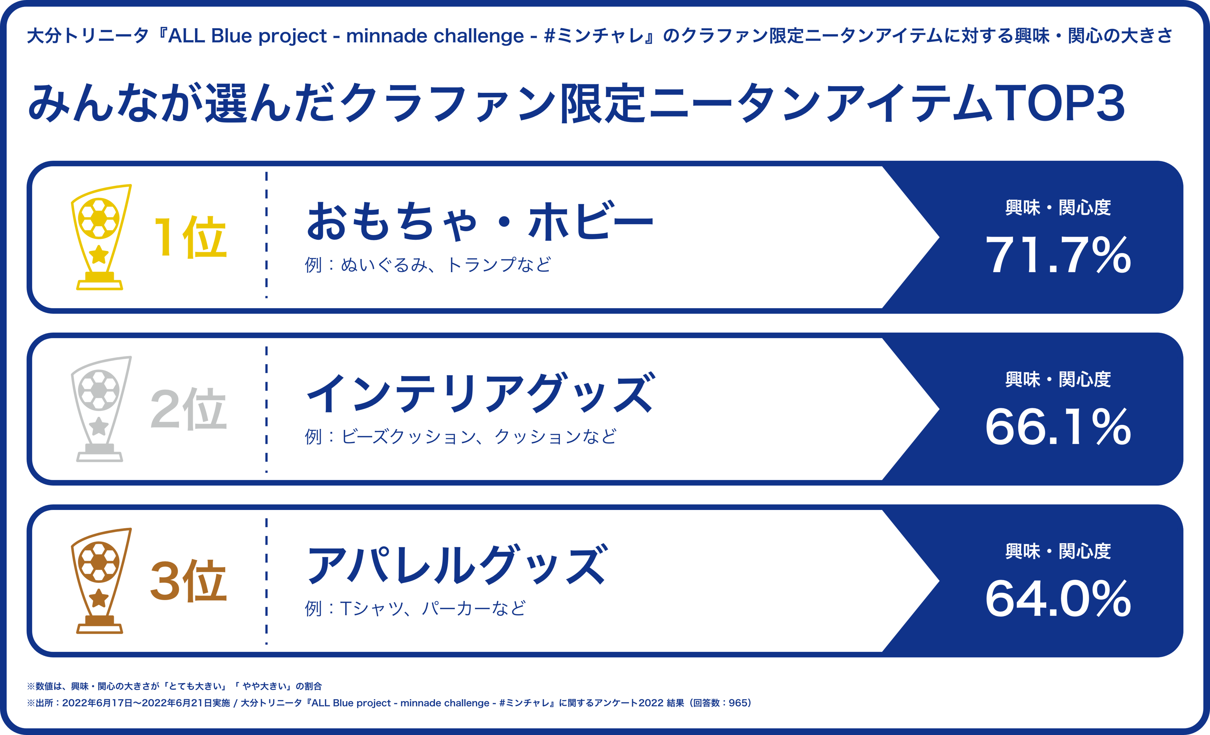 スポーツ専門クラウドファンディングを展開するスポチュニティ株式会社(東京都中央区、以下スポチュニティ)と、J2クラブの大分トリニータを運営する株式会社大分フットボールクラブ(本社:大分県大分市、代表取締役榎徹、以下大分FC)が実施するクラウドファンディングプロジェクトでは、リターン品(返礼品)に関する事前アンケートを実施しました。900名を超えるファンにご回答いただいたアンケートで、人気を集めた限定「ニータン」グッズのTOP3を発表します。