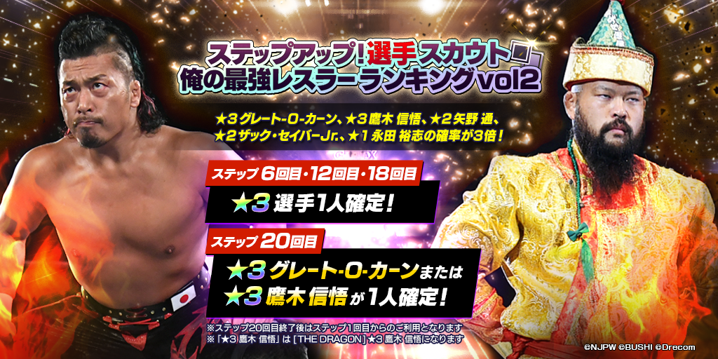 さらに、★3選手「[THE DRAGON]鷹木 信悟」または「[Dominator]グレート-O-カーン」がステップ20回目で1人スカウトできます。