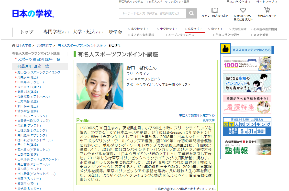 全国の大学・短大・専門学校などの学校情報を提供する、株式会社JSコーポレーション(本社:大阪市北区 代表取締役社長:米田英一)は、スポーツワンポイント講座「フリークライマー/野口啓代さん」