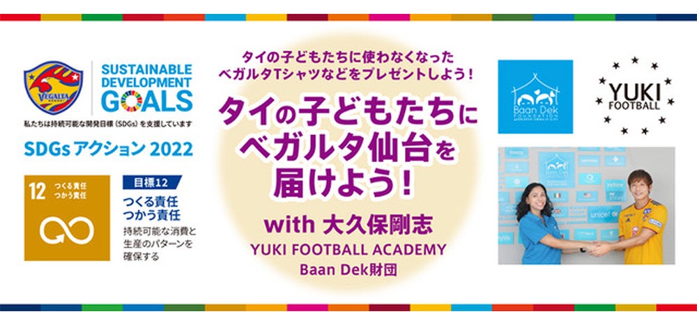 7月6日(水)開催、明治安田生命J2リーグ 第25節 ヴァンフォーレ甲府戦のイベントテーマ「ベガルタ仙台 みんなのSDGs」を通じて、当クラブのSDGs目標、12「つくる責任、つかう責任」を達成するため「タイの子どもたちにベガルタ仙台を届けよう!with 大久保剛志(YUKI FOOTBALL ACADEMY)&Baan Dek財団」を同試合で実施いたします。