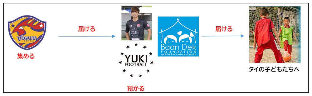本事業は「もったいない!」をキーワードに、サポーターのみなさまが使用しなくなったベガルタ仙台グッズ「Tシャツ」「ユニフォーム」「タオルマフラー」をユアスタへご持参、ご協力いただきます。回収後、当クラブOBである大久保剛志選手(タイリーグNavy FC)が運営する「YUKI FOOTBALL ACADEMY」、タイの子どもたちに教育・健康・安全を提供することを使命としてタイ国で登録、活動をされている「Baan Dek(バーンデック)財団」を通じ、タイのスラムや建設現場のキャンプで暮らす、社会的に弱い立場の子どもたちにお届けいたします。