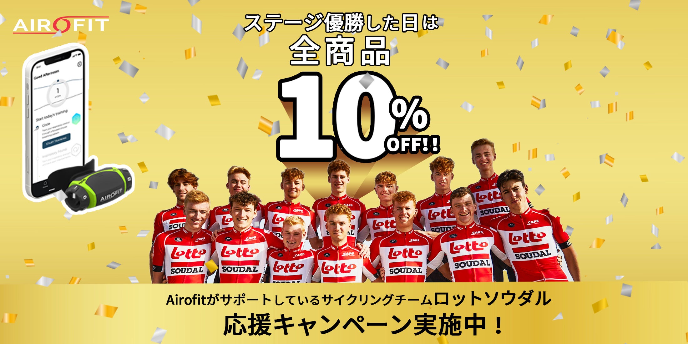 株式会社アオイロ(本社:神奈川県川崎市、代表取締役:青木孝哲、以下アオイロ)は、7月1日(金)より「ロットソウダル応援キャンペーン」を開催いたします。ツールドフランスに出場するロットソウダルチームがステージ優勝した際には呼吸筋トレーニングデバイス「エアロフィット」の全商品を10%OFFにてインターネット通販サイト「Aoiro.shop(アオイロショップ)」にて販売を予定しております。
