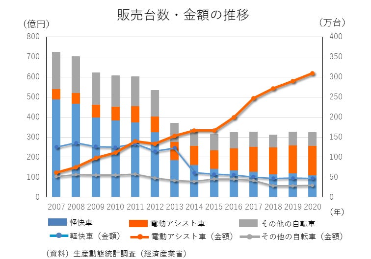 近年自転車をスポーツ・レジャーとしてライフスタイルに取り入れる人が増えつつあるなか、その流れがコロナ禍において加速、密を避けた気分転換や運動不足解消のためのレクリエーションとして自転車を楽しむ人が増えています。また、自転車のなかでも利便性の高いアシスト付きの電動自転車が人気で、経済産業省の生産動態統計調査によると電動アシスト者の販売台数・金額は近年右肩上がりになっています。
