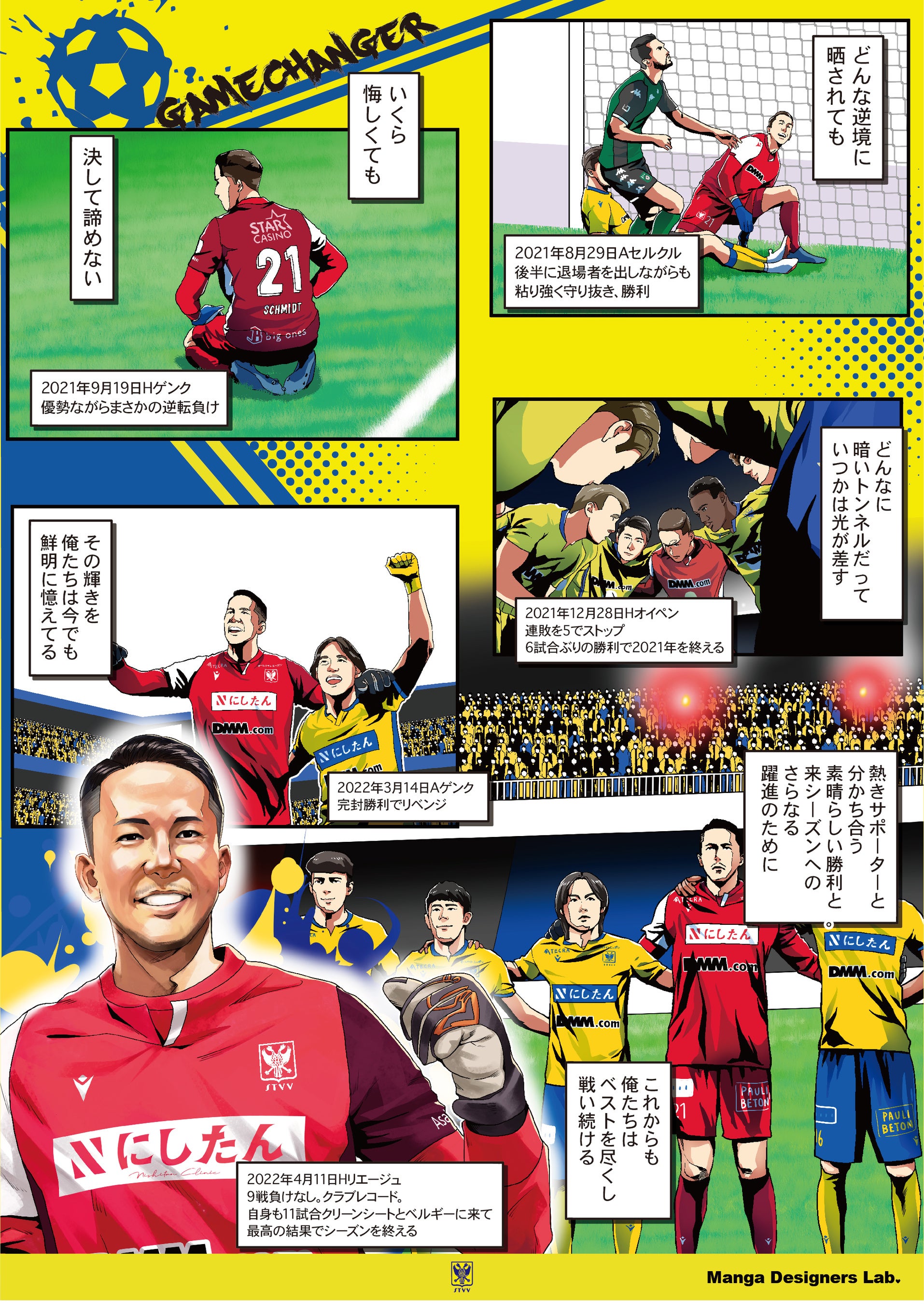 そんな折、同大サッカー部出身のコンフィダンス木村陽一郎さんから「シュミット選手のプロモーションに協力して欲しい」との依頼がありました。コンフィダンスとは、まさしくシュミット選手を応援するために彼らが立ち上げた会社であり、仲間のために尽力する彼らを応援しないわけにはいきません。早速、チームを経営されているDMM.comさんと話をし、マンガデザインによる「アライアンスパートナー(コンテンツパート)」という形で、チーム全体をマンガデザイナーズラボで応援するという今回の契約締結と至りました。