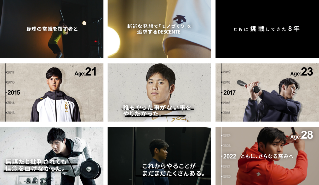 野球の常識を覆し続ける大谷翔平選手と、トップアスリートと共に今までにない「モノづくり」を目指す『デサント』の世界への挑戦は、2014年(大谷選手 当時20歳)に始まります。2015年の場面では、21歳の大谷選手の写真が映し出され、「誰もやった事がないことをやりたかった」という、大谷選手のコメントが述べられます。2016年以降も当時の大谷選手の名言や、『デサント』と共通の想いとなるメッセージを織り交ぜ、大谷選手と『デサント』が共創してきた8年間を1年ごとに振り返ります。そして、今後のさらなる大谷選手と『デサント』の挑戦を誓い、動画を締めくくります。