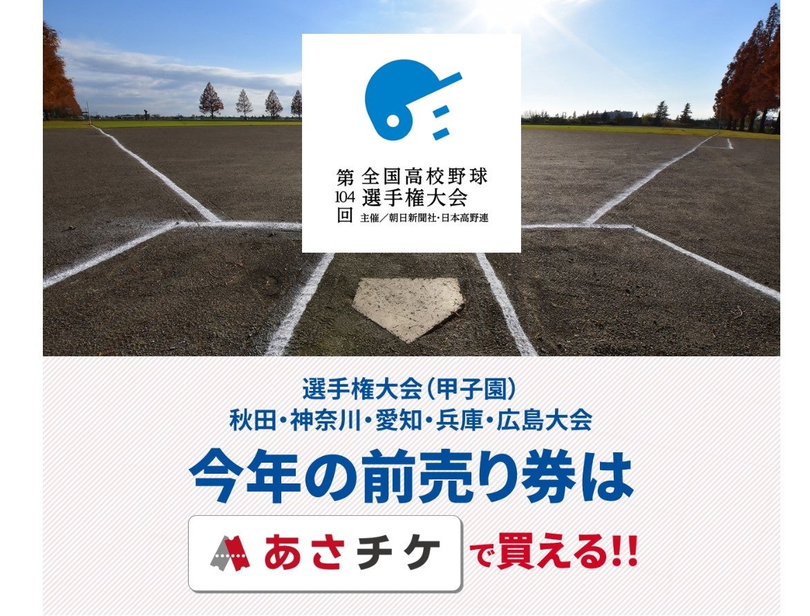 株式会社朝日新聞社(代表取締役社長:中村史郎)は7月1日から、第104回全国高等学校野球選手権大会の秋田・神奈川・愛知・兵庫・広島大会で、インターネット利用の自社チケットシステム「あさチケ(朝日チケット)」による前売り入場券の販売を始めました。