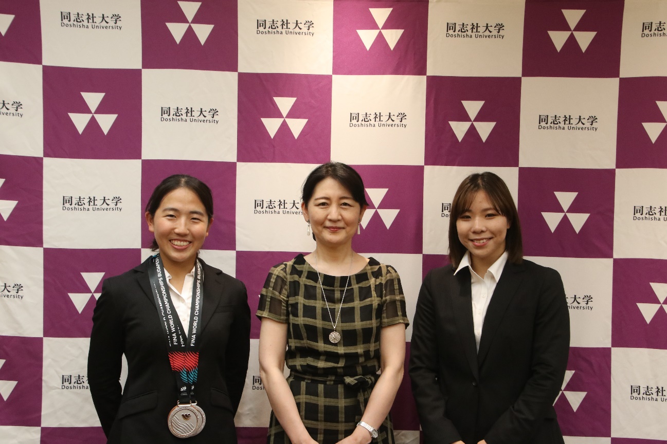 成績の報告をうけた植木学長は「大きな舞台で堂々と競技する姿を拝見し、学長として誇りに思います。本学の学生、教職員、卒業生だけでなく、全国の皆さんの励みとなるお二人の活躍に敬意を表します」と述べ、学生たちの健闘を労いました。