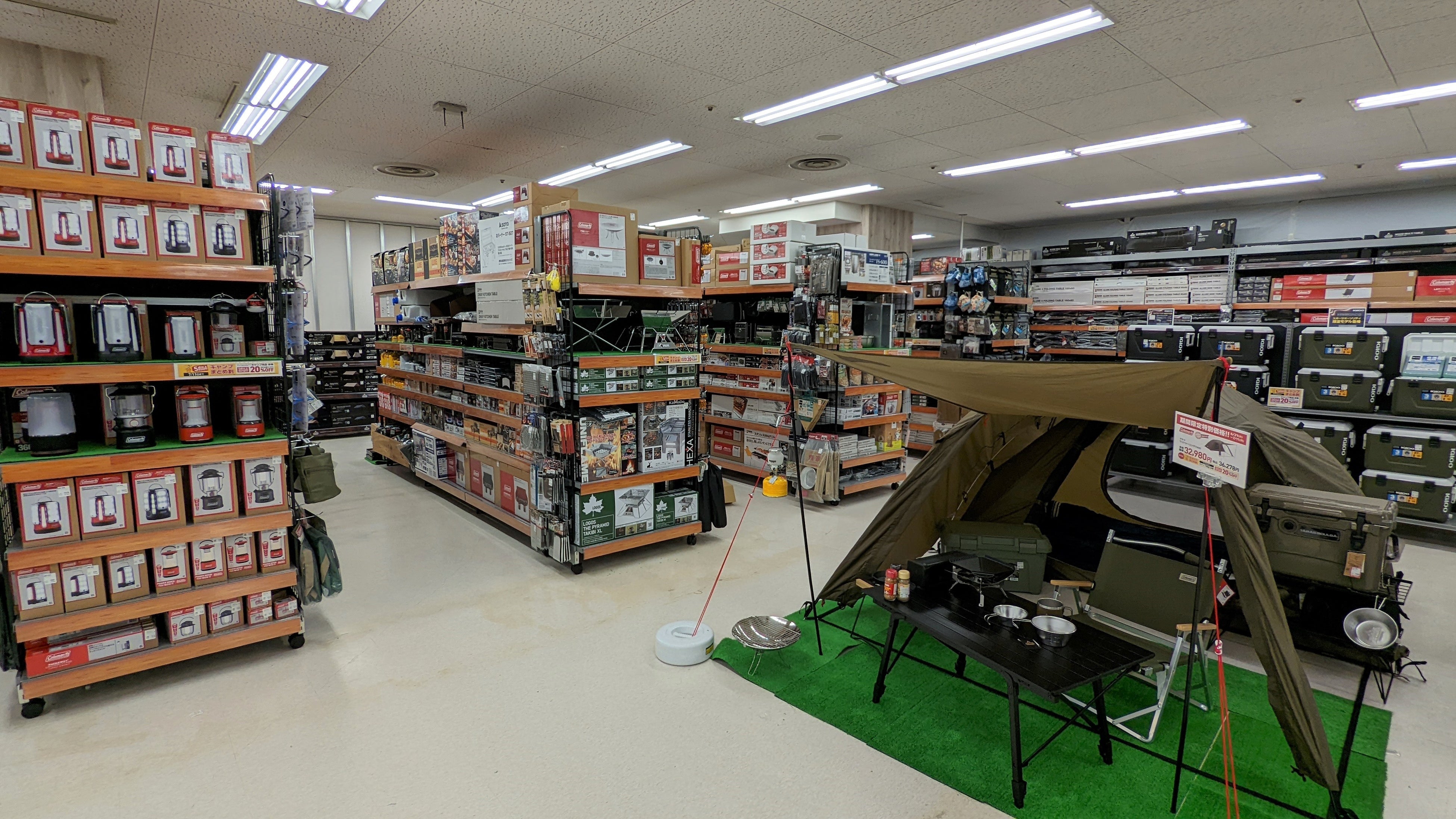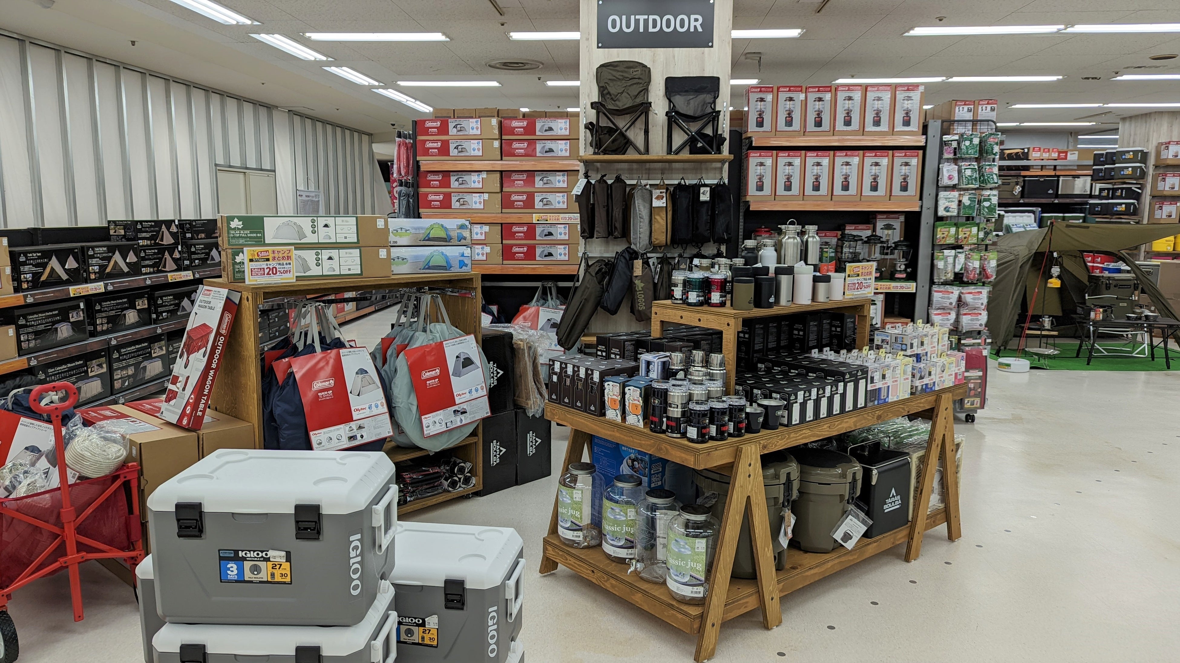 このたびの移転リニューアルで、展開スペースを拡大したアウトドアコーナーでは、テント、テーブル、チェアの展示を行い、お客さまが疑似体験できるスペースを充分に確保いたしました。