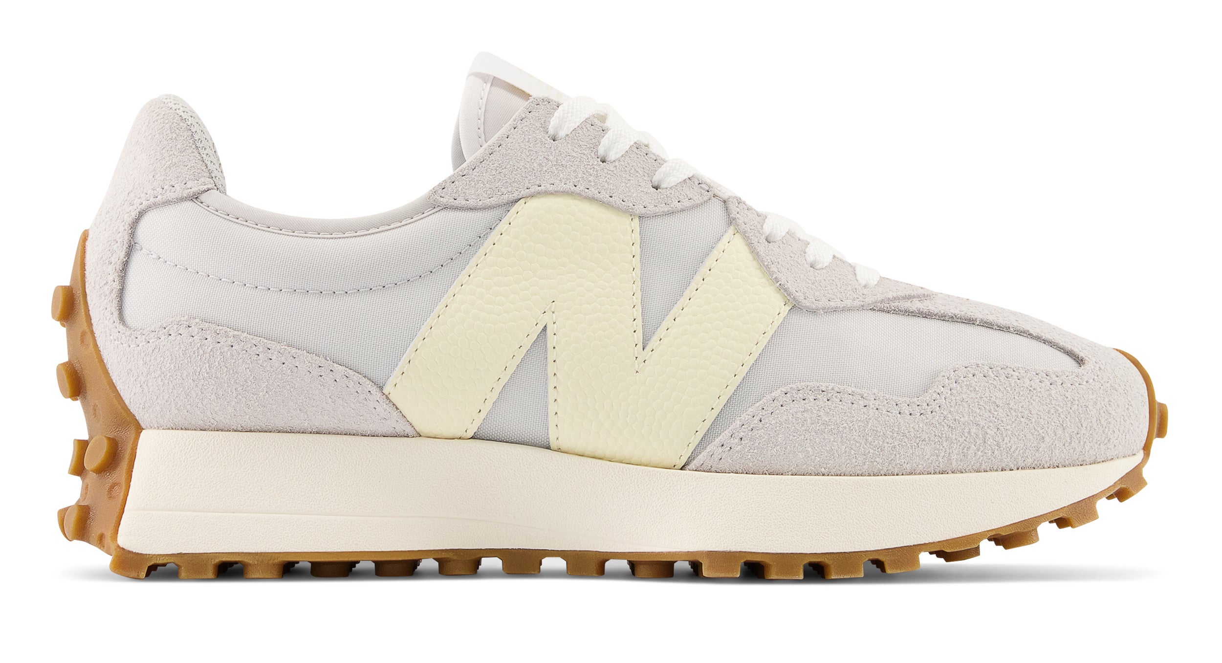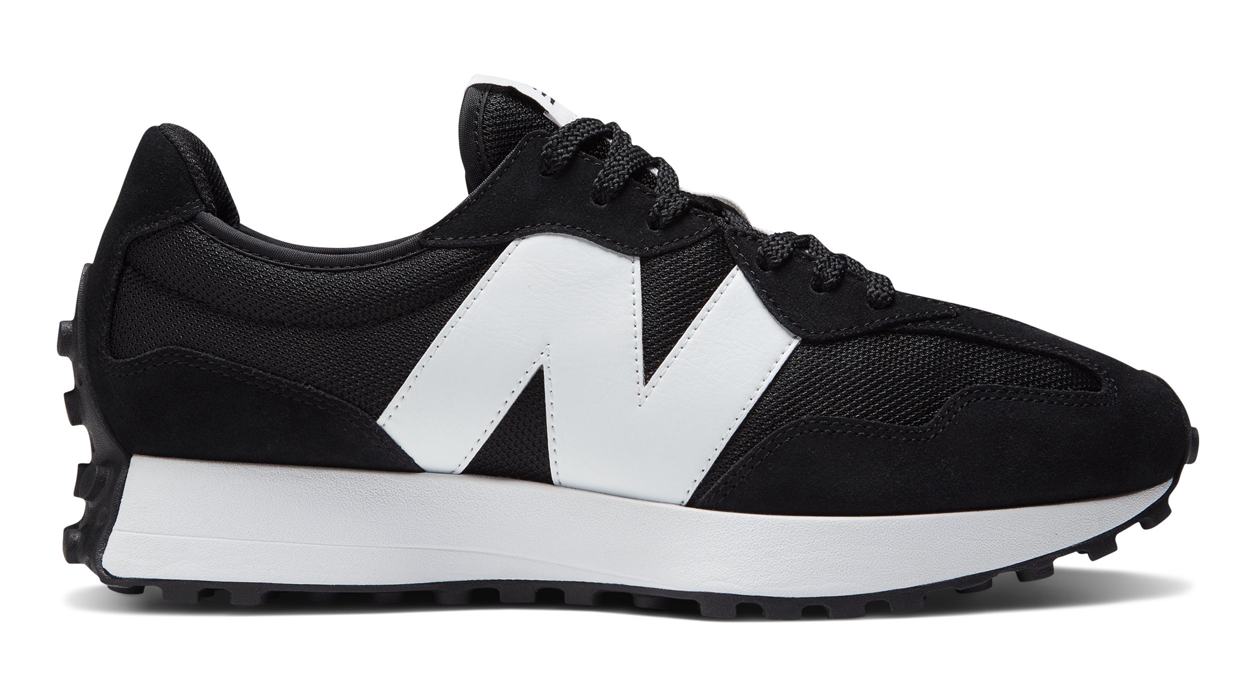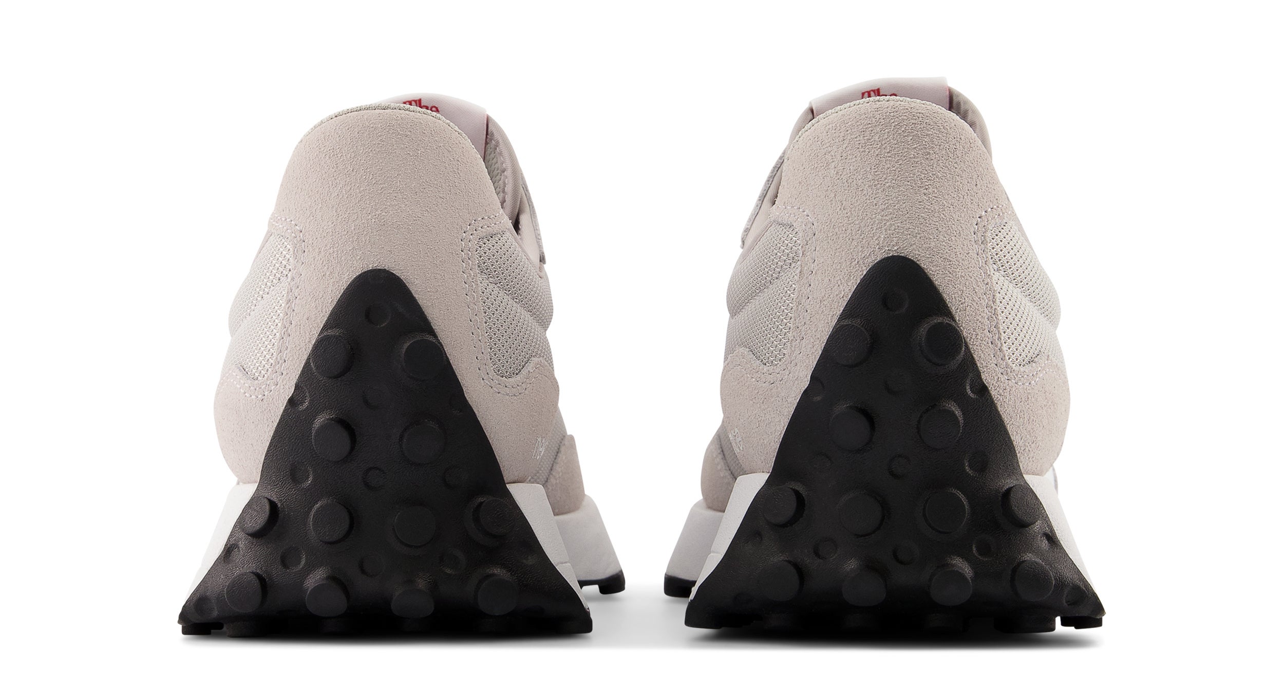 1970年代のニューバランスランニングシューズを代表する3つのモデルを元に生まれた「327」は、レトロな雰囲気でありながら、今までのニューバランスにはなかった新鮮なデザインが特徴です。ナイロン素材の採用や爪先や踵部のアウトソールの巻き上げ、ラギッドなアウトソールデザインからのレトロなイメージに、オーバーサイズのNロゴの存在感、シューズ全体を現代的な新しいシルエットとして印象付けるどのアングルから見てもフレアなミッドソールが新鮮さを生み出します。