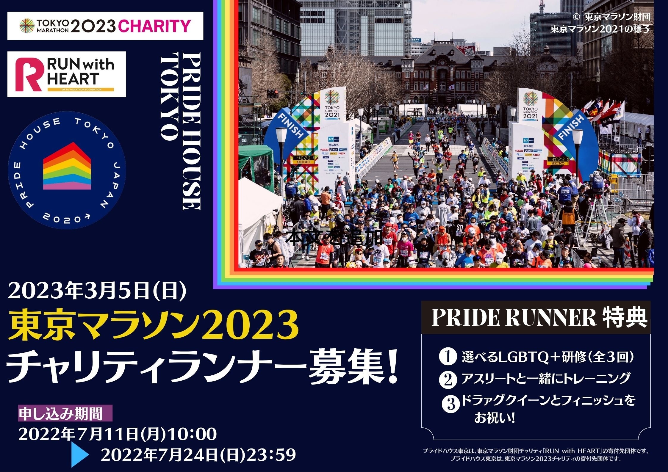 プライドハウス東京(事務局:グッド・エイジング・エールズ)は、東京マラソン財団チャリティ「RUN with HEART」の寄付先団体として、2023年3月5日(日)に開催される「東京マラソン2023」に出場するチャリティランナーを120名募集します。ランナーの皆さんには特典として、選べるLGBTQ+研修やアスリートとの事前合同トレーニングにもご参加いただけます。