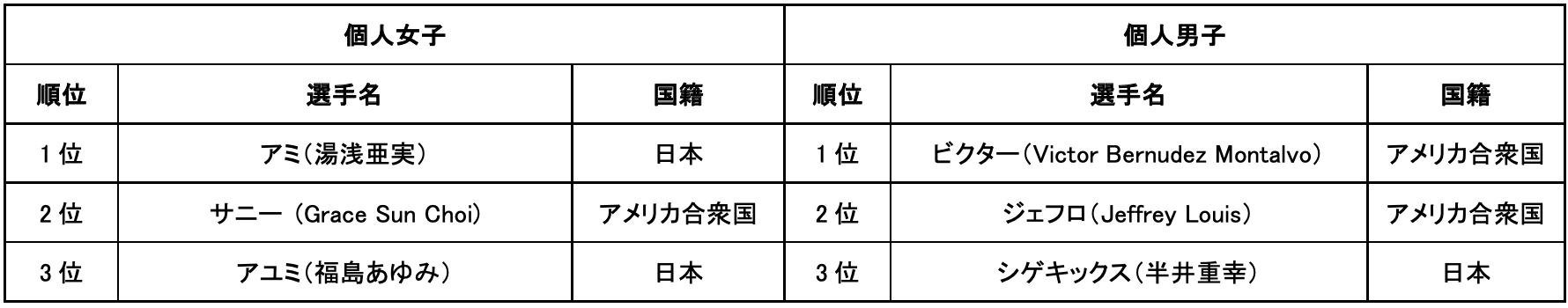 ワールドゲームズ2022におけるブレイキン種目の表彰台の結果は下記の通りです。