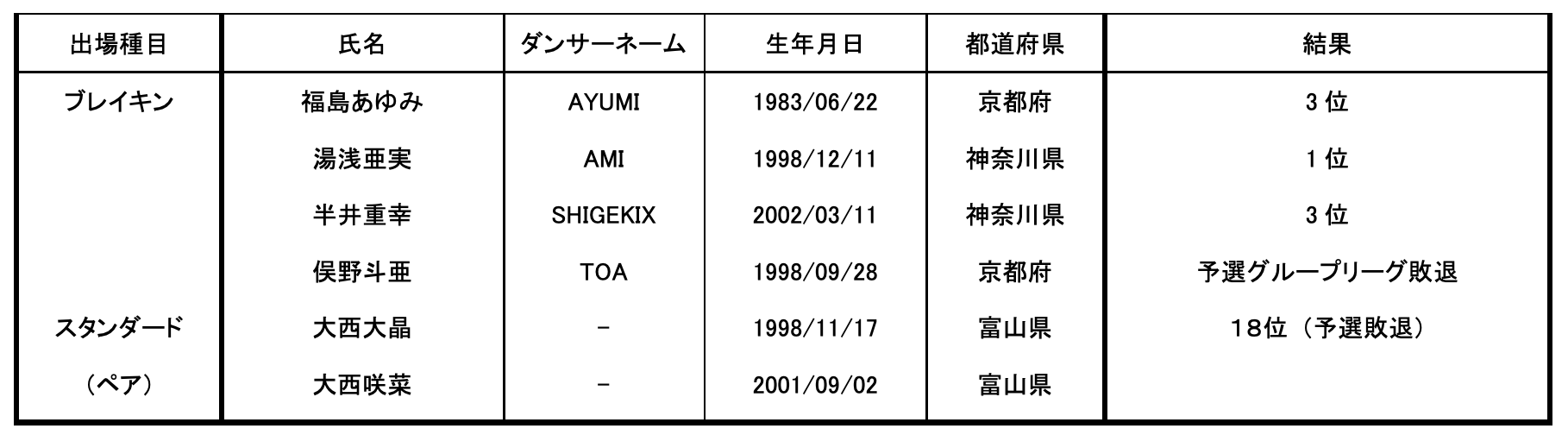 公益社団法人日本ダンススポーツ連盟(Japan DanceSport Federation; 略称JDSF)は、アメリカ合衆国・バーミングハム市にて現地時間7月7日に開幕した、第11回ワールドゲームズへブレイキン種目とスタンダード種目へ日本代表選手を派遣しました。ダンススポーツ競技での日本選手団の入賞成績は、女子 金(湯浅選手)・銅(福島)、男子 銅(半井選手)という結果になりました。ブレイキン種目へは、2021年 WDSF世界ブレイキン選手権の結果より、17ケ国から男子16名、女子16名の選手が参加しました。当初、7月9日 予選グループラウンド、10日 トップ8からのトーナメントの予定でしたが、9日に激しい雷雨のため急遽ブレイキン種目は、10日に全てのグループラウンドから決勝トーナメントまでを行う1日で実施する日程へ変更となりました。日本からは福島あゆみ選手、湯浅亜実選手、半井重幸選手、俣野斗亜選手の4名が参加しました。スタンダード種目へは、2022年の世界ランキングにおける順位により大西大晶選手・大西咲菜選手のペアが参加しました。各出場者の詳細な結果は次ページをご確認ください。