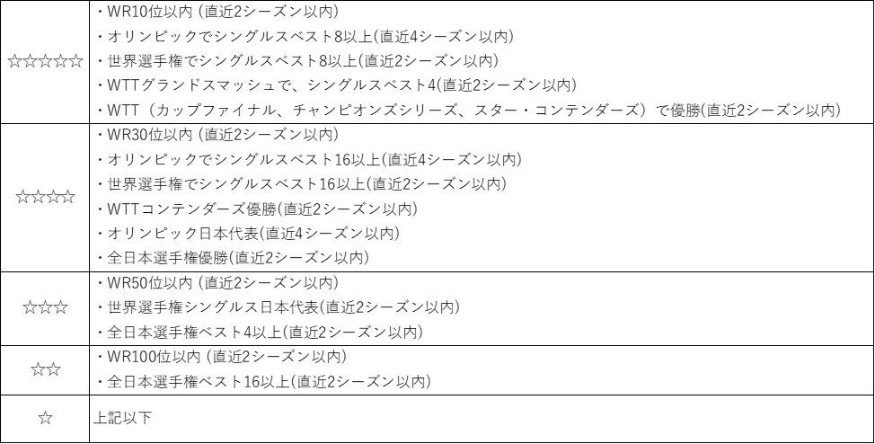 また、選手の指標として、スターランクを設定いたします。なお、スターランクによる出場選手規定(スターランク☆いくつの選手が出場しなければいけない等)は設定されません。
