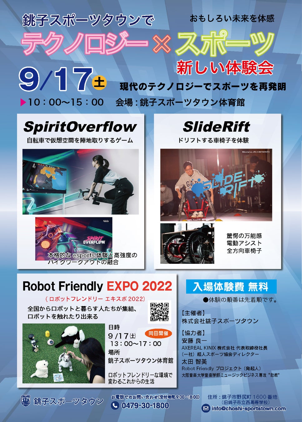 [テキスト ボックス:] 協力者 安藤良一 AXEREAL株式会社代表取締役社長 KINIX株式会社代表取締役社長 (一社)超人スポーツ協会ディレクター 太田智美 Robot Friendlyプロジェクト(発起人)ヒトとロボットの音楽ユニット「mirai capsule」大阪音楽大学音楽学部ミュージックビジネス専攻専任助教問合せ先 銚子スポーツタウン 電話 0479-30-1800 電子メール info@choshi-sportstown.com