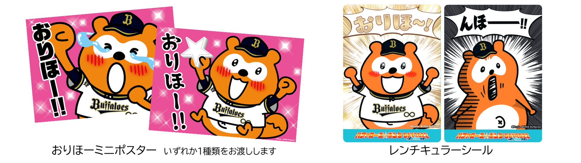 3年ぶりに京セラドーム大阪で開催する「バファローズ☆ポンタDAY 2022」では、ファンの皆様と一緒にオリックス・バファローズの応援を盛り上げる6つの企画をご用意しました。来場者特典として先着15,000名様に、「おりほーミニポスター」や見る角度で絵柄が変わる「レンチキュラーシール」をプレゼントする他、オリックス・バファローズ選手の直筆サイン入りバファローズ☆ポンタぬいぐるみが抽選で5名様に当たる「ラッキーカード」をお渡しします。また、球団公式マスコットのバファローブル、バファローベルとバファローズ☆ポンタが初めてコラボしたグッズを販売します。さらに今回、バファローズパパポンタが球場に初登場します。バファローズ☆ポンタと親子共演で、オリックス・バファローズを応援します。